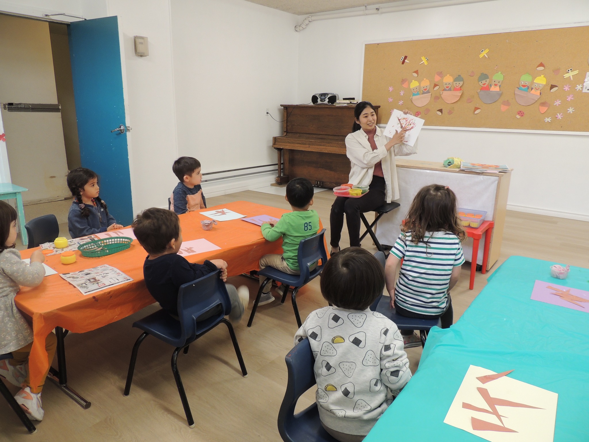 降園前の読み聞かせは、子ども達にとって楽しみの一つになっています。季節に合った絵本や日本の文化についての絵本、毎日の習慣を学ぶ絵本など、様々な種類の絵本を取り揃えています。また、紙芝居も子ども達に大人気です。もしご希望であれば、絵本の貸し出しを行っているので、ご自宅でも日本の絵本をお子様と一緒に楽しむことができますよ♪